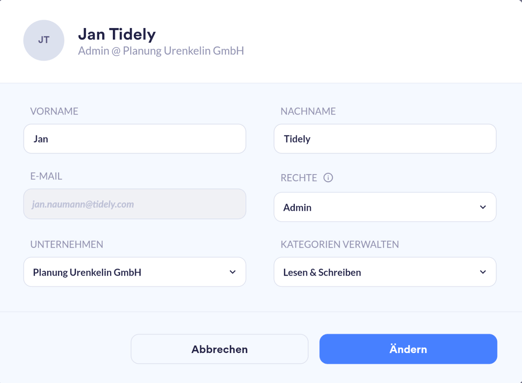 Der Admin des Hauptunternehmens kann per Klick auf einzelne Team-Mitglieder die Verwaltung der Kategorien einschränken und auf „Lesen“ setzen – unabhängig von deren individuellen Rechten (Admin, User etc.).